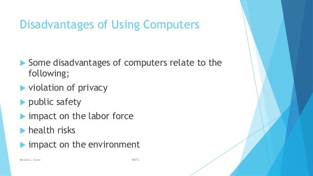 Therefore explaining the advantages and disadvantages of computer technology to teachers and students seems to be necessary. Disadvantages of Using Computers Some disadvantages of computers relate to health risks the violation of privacy public safety the impact on the labor force and the impact on the environment. Prolonged or improper computer use can lead to injuries or disorders of the hands wrists elbows eyes neck and back.